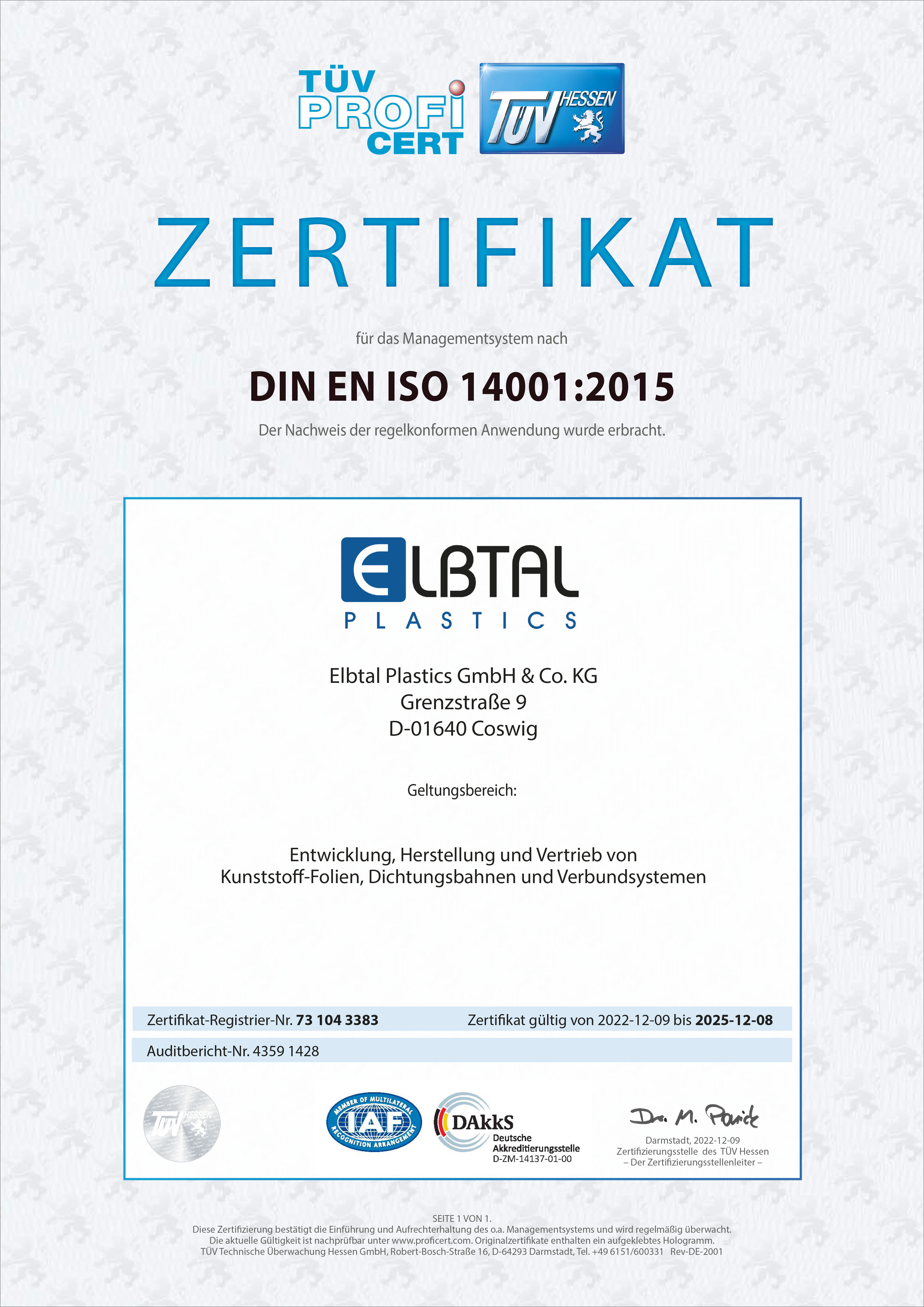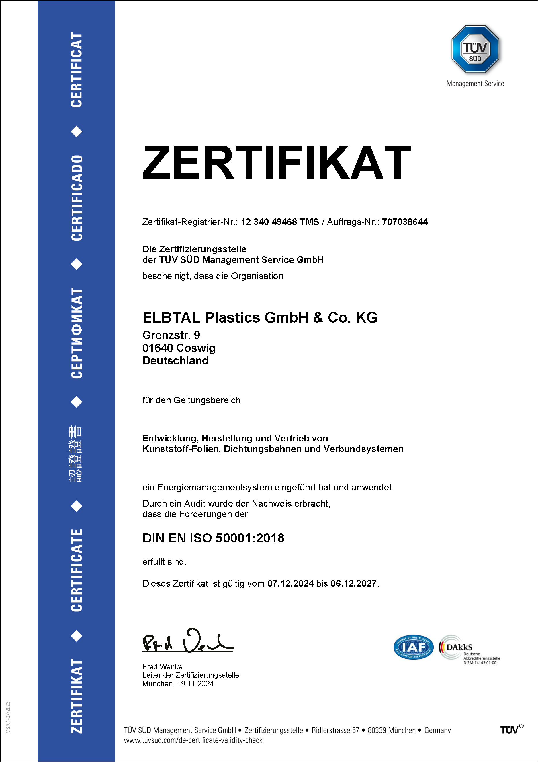 Die Elbtal Plastics GmbH & Co. KG konnte erneut erfolgreich nach der international anerkannten Norm DIN EN ISO 50001:2018 zertifiziert werden. Diese Re-Zertifizierung bestätigt unser kontinuierliches Engagement für ein systematisches, nachhaltiges und effizientes Energiemanagement.
